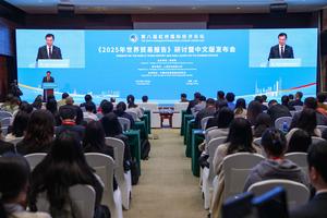 (251106) -- SHANGHAI, 6 noviembre, 2025 (Xinhua) -- Un seminario sobre el Informe sobre el Comercio Mundial 2025 y la ceremonia de lanzamiento de su edición en chino se lleva a cabo durante el VIII Foro Económico Internacional de Hongqiao en el Centro Nacional de Exposiciones y Convenciones (Shanghai), en Shanghai, en el este de China, el 6 de noviembre de 2025. (Xinhua/Wang Zecong) (rtg) (ra) (da)
