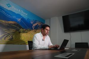 (251106) -- LIMA, 6 noviembre, 2025 (Xinhua) -- Imagen del 3 de noviembre de 2025 de Publio Santander, gerente de producto y marketing de la empresa turística Perú A Travel, trabajando en su computadora durante una entrevista con la Agencia de Noticias Xinhua, en Lima, Perú. Empresarios peruanos de los sectores turístico y agrícola que participan en la VIII Exposición Internacional de Importaciones de China (CIIE, por sus siglas en inglés) destacaron la relevancia de este evento no solo como una plataforma comercial, sino también como un espacio clave para fortalecer el intercambio cultural entre Perú y China. (Xinhua/Mariana Bazo) (mb) (rtg) (ra) (da)