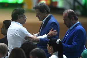 (251106) -- BELEM, 6 noviembre, 2025 (Xinhua) -- El ministro de Hacienda brasileño, Fernando Haddad (c), conversa con el presidente colombiano, Gustavo Petro (i), durante la Cumbre de Líderes que antecede a la 30ª Conferencia de las Partes (COP30) de las Naciones Unidas sobre el Cambio Climático, en Belém, estado de Pará, Brasil, el 6 de noviembre de 2025. (Xinhua/Lucio Tavora) (lt) (rtg) (ra) (da)