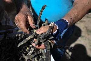 (251106) -- COQUIMBO, 6 noviembre, 2025 (Xinhua) -- Imagen del 29 de octubre 2025 del agricultor Rolando Rojas recolectando semillas de las vainas de habas en la Parcela de Multiplicación de Semillas del Instituto de Investigaciones Agropecuarias de Chile, en la comuna de Vicuña, en la región de Coquimbo, Chile. La sequía estructural que azota en el norte chileno ha cambiado la forma de hacer agricultura. Sin embargo, un grupo de resilientes agricultores se han transformado en los "guardianes de las semillas", al cuidar los granos para proteger el ecosistema y los sabores atávicos de los eclécticos valles del país sudamericano. (Xinhua/Jorge Villegas) (jv) (jg) (ah) (da)
