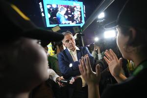 (251106) — MONTEVIDEO, 6 noviembre, 2025 (Xinhua) — El presidente uruguayo, Yamandú Orsi (c), escucha las explicaciones sobre un trabajo de robótica realizado por alumnos de liceo durante la Olimpíada de Robótica, Programación y Videojuegos de Ceibal Edición 12, llevada a cabo en el Antel Arena, en Montevideo, capital de Uruguay, el 6 de noviembre de 2025. (Xinhua/Nicolás Celaya) (nc) (jg) (ah) (da)