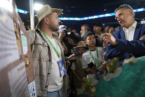 (251106) -- MONTEVIDEO, 6 noviembre, 2025 (Xinhua) -- El presidente uruguayo, Yamandú Orsi (d), escucha las explicaciones de un profesor sobre un trabajo de robótica realizado por alumnos de liceo durante la Olimpíada de Robótica, Programación y Videojuegos de Ceibal Edición 12, llevada a cabo en el Antel Arena, en Montevideo, capital de Uruguay, el 6 de noviembre de 2025. (Xinhua/Nicolás Celaya) (nc) (jg) (ah) (da)