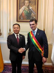 (251109) -- LA PAZ, 9 noviembre, 2025 (Xinhua) -- El presidente de Bolivia, Rodrigo Paz, se reúne con el enviado especial del presidente chino Xi Jinping, Li Guoying, también ministro de Recursos Hídricos de China, después de su ceremonia de investidura, en La Paz, Bolivia, el 8 de noviembre de 2025. Li asistió a la ceremonia de investidura de Rodrigo Paz, en La Paz, por invitación del Gobierno boliviano. (Xinhua/Embajada China en Bolivia) (rtg) (ah)