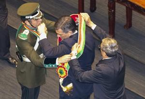 (251108) -- LA PAZ, 8 noviembre, 2025 (Xinhua) -- Rodrigo Paz (c) recibe la banda presidencial durante su ceremonia de juramentación en la Asamblea Legislativa Plurinacional, en la ciudad de La Paz, Bolivia, el 8 de noviembre de 2025. Rodrigo Paz juró el sábado como nuevo presidente de Bolivia para el período 2025-2030, con un discurso en el que aseguró que su gestión no estará orientada al control del poder, sino al servicio público. (Xinhua/Li Mengxin) (jg) (da)