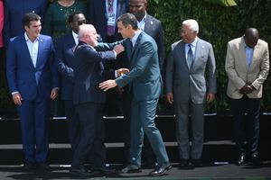 (251107) -- BELEM, 7 noviembre, 2025 (Xinhua) -- El presidente brasileño, Luiz Inácio Lula da Silva (i-frente), y el presidente del Gobierno español, Pedro Sánchez (d-frente), reaccionan previo a la toma de la foto de familia de la Cumbre de los Líderes de la 30ª Conferencia de las Partes (COP30) de las Naciones Unidas sobre el Cambio Climático, en Belém, estado de Pará, Brasil, el 7 de noviembre de 2025. (Xinhua/Lucio Tavora) (lt) (oa) (ra) (ce)