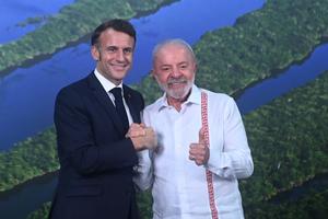 (251107) -- BELEM, 7 noviembre, 2025 (Xinhua) -- Imagen del 6 de noviembre de 2025 del presidente brasileño, Luiz Inácio Lula da Silva (d), y el presidente francés, Emmanuel Macron (i), posando para una fotografía después de una reunión bilateral en el marco de la Cumbre de los Líderes de la 30ª Conferencia de las Partes (COP30) de las Naciones Unidas sobre el Cambio Climático, en Belém, estado de Pará, Brasil. Macron alertó el jueves que la desinformación climática representa "una amenaza directa para las democracias", durante su discurso en la Cumbre de los Líderes de la COP30 de las Naciones Unidas sobre el Cambio Climático. (Xinhua/Lucio Tavora) (lt) (oa) (ra) (ce)