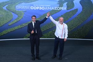 (251107) -- BELEM, 7 noviembre, 2025 (Xinhua) -- Imagen del 6 de noviembre de 2025 del presidente brasileño, Luiz Inácio Lula da Silva (d), y el presidente francés, Emmanuel Macron (i), posando para una fotografía después de una reunión bilateral en el marco de la Cumbre de los Líderes de la 30ª Conferencia de las Partes (COP30) de las Naciones Unidas sobre el Cambio Climático, en Belém, estado de Pará, Brasil. Macron alertó el jueves que la desinformación climática representa "una amenaza directa para las democracias", durante su discurso en la Cumbre de los Líderes de la COP30 de las Naciones Unidas sobre el Cambio Climático. (Xinhua/Lucio Tavora) (lt) (oa) (ra) (ce)