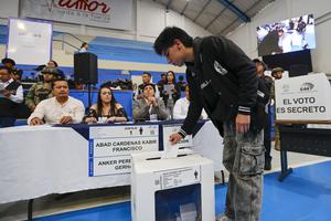 (251109) -- QUITO, 9 noviembre, 2025 (Xinhua) -- Un participante deposita una papeleta en la urna durante el Simulacro Nacional de la Consulta Popular y Referendo 2025, organizado por el Consejo Nacional Electoral (CNE) en el auditorio de la Universidad Politécnica Salesiana, en la ciudad Quito, en la capital de Ecuador, el 9 de noviembre de 2025. El CNE de Ecuador realizó el domingo un simulacro a nivel nacional de la consulta popular y el referendo constitucional convocados por el Gobierno para el próximo 16 de noviembre, informó la presidenta del organismo, Diana Atamaint. (Xinhua/Ricardo Landeta) (rl) (rtg) (da)