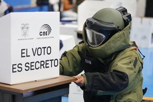 (251109) -- QUITO, 9 noviembre, 2025 (Xinhua) -- Un técnico de la Unidad de Desactivación de Explosivos ejecuta un procedimiento de seguridad preventiva durante el Simulacro Nacional de la Consulta Popular y Referendo 2025, organizado por el Consejo Nacional Electoral (CNE) en el auditorio de la Universidad Politécnica Salesiana, en la ciudad Quito, en la capital de Ecuador, el 9 de noviembre de 2025. El CNE de Ecuador realizó el domingo un simulacro a nivel nacional de la consulta popular y el referendo constitucional convocados por el Gobierno para el próximo 16 de noviembre, informó la presidenta del organismo, Diana Atamaint. (Xinhua/Ricardo Landeta) (rl) (rtg) (da)