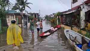(251109) -- PROVINCIA DE CATANDUANES, 9 noviembre, 2025 (Xinhua) -- Casas son sumergidas en aguas de inundación debido al tifón Fung-wong, en la provincia de Catanduanes, Filipinas, el 9 de noviembre de 2025. El domingo por la mañana, Fung-wong se ubicaba a 125 kilómetros al este de Catanduanes, en la región de Bícol, con vientos máximos sostenidos de 185 km/h y ráfagas de hasta 230 km/h. Se desplazaba hacia el oeste-noroeste a 30 km/h. Fung-wong es el vigésimo primer ciclón tropical que azota Filipinas este año, superando el promedio anual de 20 tormentas en el país. (Xinhua/Unidad de Gobierno Local de Catanduanes) (rtg) (da)