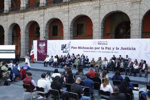 (251109) -- CIUDAD DE MEXICO, 9 noviembre, 2025 (Xinhua) -- La presidenta mexicana, Claudia Sheinbaum, habla durante la presentación del Plan Michoacán por la Paz y la Justicia, en el Palacio Nacional, en la Ciudad de México, capital de México, el 9 de noviembre de 2025. (Xinhua/Francisco Cañedo) (fc) (rtg) (da)