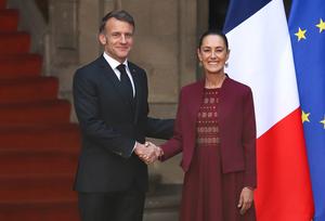 (251107) -- CIUDAD DE MEXICO, 7 noviembre, 2025 (Xinhua) -- La presidenta mexicana, Claudia Sheinbaum (d), estrecha la mano del presidente francés, Emmanuel Macron (i), durante una ceremonia de bienvenida en Palacio Nacional, en la Ciudad de México, capital de México, el 7 de noviembre de 2025. (Xinhua/Daniel Augusto) (oa) (ra) (da)