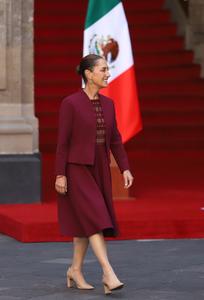 (251107) -- CIUDAD DE MEXICO, 7 noviembre, 2025 (Xinhua) -- La presidenta mexicana, Claudia Sheinbaum, asiste una ceremonia de bienvenida para el presidente francés, Emmanuel Macron, en Palacio Nacional, en la Ciudad de México, capital de México, el 7 de noviembre de 2025. (Xinhua/Daniel Augusto) (oa) (ra) (da)