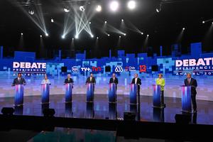(251111) -- SANTIAGO, 11 noviembre, 2025 (Xinhua) -- (De izq. a der.) Imagen del 10 de noviembre de 2025 de los candidatos a la Presidencia chilena, el economista, Franco Parisi, la abanderada del oficialismo, Jeannette Jara, el fundador del Grupo de Puebla, Marco Enríquez-Ominami, el diputado libertario, Johannes Kaiser, el abogado y excandidato presidencial derechista en 2017 y 2021, José Antonio Kast, el profesor de izquierda, Eduardo Artés, la economista liberal, Evelyn Matthei, y el político y dirigente deportivo, Harold Mayne-Nicholls, preparándose para participar en el debate presidencial organizado por la Asociación Nacional de Televisión, en Santiago, capital de Chile. El último debate presidencial chileno con miras a las elecciones del próximo domingo 16 de noviembre, estuvo centrado en los temas de seguridad, la persecución del dinero ilegal y el ejercicio de mano dura con la migración, temas en que los candidatos buscan diferenciarse para alcanzar la segunda vuelta electoral. (Xinhua/Jorge Villegas) (jv) (oa) (ah) (ce)