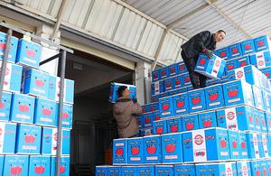 (251111) -- BEIJING, 11 noviembre, 2025 (Xinhua) -- Empleados cargan cajas de manzanas para su venta en un parque industrial, en el distrito de Jingning de la ciudad de Pingliang, en la provincia de Gansu, en el noreste de China, el 11 de noviembre de 2025. Las compañías de comercio electrónico y logística a lo largo de China están trabajando a plena capacidad durante el festival anual de compras "Doble Once". (Xinhua/Wang Yi) (oa) (ah) (ce)
