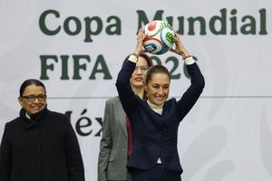 (251110) -- CIUDAD DE MEXICO, 10 noviembre, 2025 (Xinhua) -- La presidenta mexicana, Claudia Sheinbaum (frente), sostiene un balón durante la presentación de la Copa Mundial FIFA 2026, en el Complejo Cultural Los Pinos, en la Ciudad de México, capital de México, el 10 de noviembre de 2025. Sheinbaum presentó el lunes la Copa Mundial FIFA 2026, cuya inauguración se realizará el 11 de junio en la Ciudad de México, y la calificó como una "fiesta mundialista" que llenará de alegría al país y al mundo. (Xinhua/Francisco Cañedo) (fc) (oa) (ah) (ce)