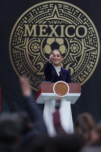 (251110) -- CIUDAD DE MEXICO, 10 noviembre, 2025 (Xinhua) -- La presidenta mexicana, Claudia Sheinbaum, habla durante la presentación de la Copa Mundial FIFA 2026, en el Complejo Cultural Los Pinos, en la Ciudad de México, capital de México, el 10 de noviembre de 2025. Sheinbaum presentó el lunes la Copa Mundial FIFA 2026, cuya inauguración se realizará el 11 de junio en la Ciudad de México, y la calificó como una "fiesta mundialista" que llenará de alegría al país y al mundo. (Xinhua/Francisco Cañedo) (fc) (oa) (ah) (ce)