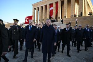(251110) -- ANKARA, 10 noviembre, 2025 (Xinhua) -- El presidente turco, Recep Tayyip Erdogan (c), asiste a una ceremonia para conmemorar el 87 aniversario de la muerte de Mustafa Kemal Ataturk, el fundador de la República de Turquía, en el mausoleo de Ataturk, en Ankara, Turquía, el 10 de noviembre de 2025. Las conmemoraciones se llevaron a cabo en Turquía el lunes para marcar el 87 aniversario de la muerte de Mustafa Kemal Ataturk, fundador de la República de Turquía. (Xinhua/Mustafa Kaya) (rtg) (ah) (ce)