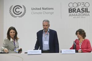 (251112) -- BELEM, 12 noviembre, 2025 (Xinhua) -- El presidente de la 30ª Conferencia de las Partes (COP30) de la Convención Marco de las Naciones Unidas sobre el Cambio Climático, André Correa do Lago (c), la directora ejecutiva de la COP30, Ana Toni (i), y la directora de Clima de la cancillería brasileña, Liliam Chagas (d), asisten a una conferencia de prensa, en Belém, estado de Pará, Brasil, el 12 de noviembre de 2025. La presidencia brasileña de la COP30 que se lleva a cabo en la ciudad de Belém, en el estado amazónico de Pará, en el norte de Brasil, informó el miércoles sobre avances iniciales en las negociaciones de la agenda climática, al destacar el espíritu constructivo de las delegaciones. (Xinhua/Lucio Tavora) (lt) (ah) (ra) (ce)