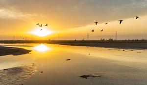 (251112) -- SHIZUISHAN, 12 noviembre, 2025 (Xinhua) -- Vista aérea tomada con un dron el 11 de noviembre de 2025 de aves migratorias volando sobre el Parque Nacional de Humedales Tianhewan, en el distrito de Pingluo de Shizuishan, en la región autónoma de la etnia hui de Ningxia, en el noroeste de China. Ubicado en el distrito de Pingluo, Ningxia, y adyacente al río Amarillo, el Parque Nacional de Humedales Tianhewan constituye una importante barrera ecológica en la cuenca del río Amarillo. (Xinhua/Yang Zhisen) (jg) (da) (ce)