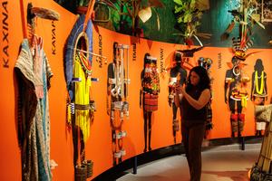 (251113) -- BELEM, 13 noviembre, 2025 (Xinhua) -- Una mujer toma una fotografía durante la exposición "Brasil: Tierra Indígena" en el Museo Paraense Emílio Goeldi, en Belém, estado de Pará, Brasil, el 13 de noviembre de 2025. (Xinhua/Claudia Martini) (cm) (rtg) (da)