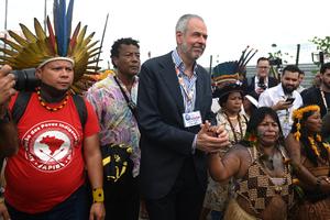 (251114) -- BELEM, 14 noviembre, 2025 (Xinhua) -- El presidente de la 30ª Conferencia de las Partes (COP30) de la Convención Marco de las Naciones Unidas sobre el Cambio Climático, André Correa do Lago (c), camina junto a indígenas en el exterior del pabellón en donde se lleva a cabo la COP30, en Belém, estado de Pará, Brasil, el 14 de noviembre de 2025. (Xinhua/Lucio Tavora) (lt) (oa) (da)