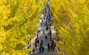 (251116) -- BEIJING, 16 noviembre, 2025 (Xinhua) -- Vista aérea tomada con un dron el 15 de noviembre de 2025 de turistas disfrutando de los árboles gingko a lo largo de un camino, en el poblado de Tongji de la ciudad de Pengzhou, en la provincia de Sichuan, en el suroeste de China (Xinhua/Luo Guoyang) (rtg) (ah)
