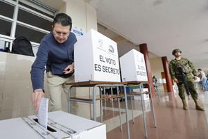 (251116) -- QUITO, 16 noviembre, 2025 (Xinhua) -- Un ciudadano deposita su papeleta en una urna durante la jornada electoral en el Colegio San Gabriel, en Quito, capital de Ecuador, el 16 de noviembre de 2025. Los colegios electorales en Ecuador abrieron el domingo a las 07:00 hora local (12:00 GMT) para las votaciones de la consulta popular y referendo constitucional impulsados por el Gobierno sobre temas políticos y de seguridad nacional. (Xinhua/Ricardo Landeta) (rl) (rtg) (da)