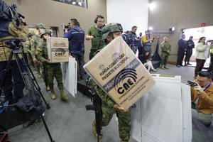 (251114) -- QUITO, 14 noviembre, 2025 (Xinhua) -- Miembros de las Fuerzas Armadas trasladan los paquetes electorales destinados a la jornada "Voto en Casa", en la que grupos prioritarios y con discapacidad ejercerán el sufragio en sus hogares, en el marco de la consulta popular y el referendo constitucional, en la ciudad de Quito, capital de Ecuador, el 14 de noviembre de 2025. En Ecuador, donde el voto es obligatorio, el Consejo Nacional Electoral llevó también a cabo a primera hora del viernes la jornada conocida como "Voto en Casa", en la que sufragaron 597 electores a escala nacional, distribuidos en 174 Juntas Receptoras del Voto Móvil. (Xinhua/Ricardo Landeta) (rl) (jg) (da)