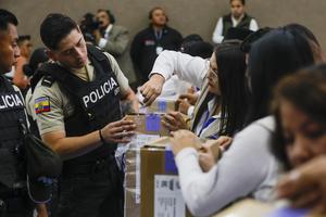 (251114) -- QUITO, 14 noviembre, 2025 (Xinhua) -- Policías y personal técnico del Consejo Nacional Electoral (CNE) verifican los sellos y preparan los paquetes electorales que serán utilizados en la jornada "Voto en Casa", en la que grupos prioritarios y con discapacidad ejercerán el sufragio en sus hogares, en el marco de la consulta popular y el referendo constitucional, en la ciudad de Quito, capital de Ecuador, el 14 de noviembre de 2025. En Ecuador, donde el voto es obligatorio, el Consejo Nacional Electoral llevó también a cabo a primera hora del viernes la jornada conocida como "Voto en Casa", en la que sufragaron 597 electores a escala nacional, distribuidos en 174 Juntas Receptoras del Voto Móvil. (Xinhua/Ricardo Landeta) (rl) (jg) (da)