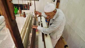 (251116) -- TRIPOLI, 16 noviembre, 2025 (Xinhua) -- Imagen del 13 de noviembre de 2025 de un adulto mayor tejiendo tela con técnicas de tejido tradicional, en Trípoli, Libia. (Xinhua/Hazem Turkia) (rtg) (da)
