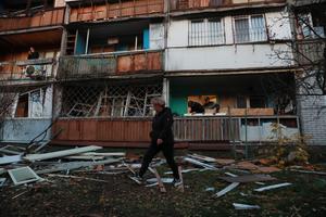 (251114) -- KIEV, 14 noviembre, 2025 (Xinhua) -- Personas reparan un edificio residencial dañado tras los ataques nocturnos con drones y misiles balísticos rusos, en Kiev, Ucrania, el 14 de noviembre de 2025. (Xinhua/Li Dongxu) (oa) (da)