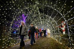 (251114) -- RIXENSART, 14 noviembre, 2025 (Xinhua) -- Imagen del 13 de noviembre de 2025 de personas visitando el espectáculo de luces "Jardín de Luces -- Los Pitufos", en el Castillo de Rixensart, en Rixensart, Brabante Valón, Bélgica. Este espectáculo inmersivo de luces se estrenó aquí la noche del jueves. Instalaciones iluminadas y música transformaron los jardines en una experiencia nocturna mágica, invitando a los visitantes a explorar el encantador mundo de los Pitufos. (Xinhua/Lyu You) (oa) (da)