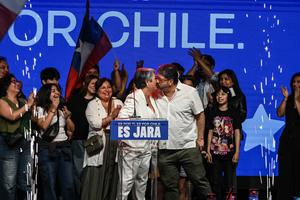 (251117) -- SANTIAGO, 17 noviembre, 2025 (Xinhua) -- Imagen del 16 de noviembre de 2025 de la candidata a la Presidencia chilena, abanderada de la izquierda y el oficialismo, Jeannette Jara (i-frente), besando a su pareja, Claudio Rodríguez Díaz (d-frente), luego de la primera vuelta de las elecciones presidenciales, en la ciudad de Santiago, capital de Chile. La candidata izquierdista Jeannette Jara y el ultraderechista José Antonio Kast disputarán el balotaje por la presidencia de Chile el 14 de diciembre próximo, tras obtener las primeras preferencias en las elecciones generales del domingo. (Xinhua/Jorge VIllegas) (jv) (rtg) (ah) (vf)