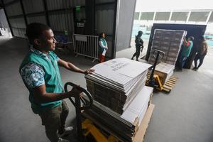 (251115) -- QUITO, 15 noviembre, 2025 (Xinhua) -- Trabajadores del Consejo Nacional Electoral (CNE) transportan material electoral a un camión durante el inicio de la distribución de paquetes electorales del CNE en las instalaciones de la empresa integradora Montgar, en la localidad de Pifo, en el noreste Quito, Ecuador, el 15 de noviembre de 2025. Más de 13,9 millones de ecuatorianos están convocados a las urnas para responder "Sí" o "No" en la consulta popular que incluye una pregunta sobre si están o no de acuerdo en que se convoque e instale una Asamblea Constituyente para elaborar una nueva Constitución. (Xinhua/Ricardo Landeta) (rl) (jg) (da)