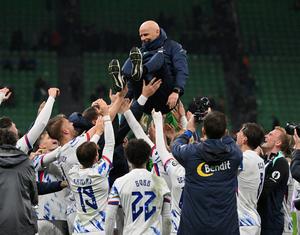 (251117) -- MILAN, 17 noviembre, 2025 (Xinhua) -- Imagen del 16 de noviembre de 2025 del director técnico Stale Solbakken (arriba), de Noruega, festejando con los jugadores al término del partido de las Clasificatorias Europeas para la Copa Mundial 2026 entre Italia y Noruega, en Milán, Italia. (Xinhua/Alberto Lingria) (oa) (ah) (vf)