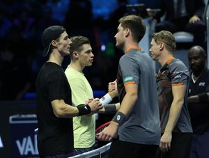 (251117) -- TURIN, 17 noviembre, 2025 (Xinhua) -- Imagen del 16 de noviembre de 2025 de Harri Heliovaara (d)/Henry Patten (2-d) y Joe Salisbury (i)/Neal Skupski (2-i) reaccionando después del partido final de dobles masculinos entre Harri Heliovaara, de Finlandia, y Henry Patten, de Reino Unido, y Joe Salisbury/Neal Skupski, de Reino Unido, en el torneo de tenis ATP Finals, en Turín, Italia. (Xinhua/Li Jing) (oa) (ah) (vf)