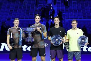 (251117) -- TURIN, 17 noviembre, 2025 (Xinhua) -- Imagen del 16 de noviembre de 2025 de Harri Heliovaara (i)/Henry Patten (2-i) y Joe Salisbury/Neal Skupski (d) posando con los trofeos después del partido final de dobles masculinos entre Harri Heliovaara, de Finlandia, y Henry Patten, de Reino Unido, y Joe Salisbury/Neal Skupski, de Reino Unido, en el torneo de tenis ATP Finals, en Turín, Italia. (Xinhua/Li Jing) (oa) (ah) (vf)