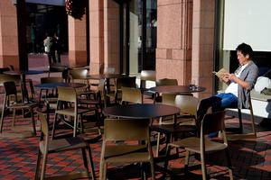 (251117) -- TOKIO, 17 noviembre, 2025 (Xinhua) -- Un hombre descansa frente a una cafetería, en Tokio, Japón, el 17 de noviembre de 2025. Las acciones de Tokio ampliaron sus pérdidas el lunes, lastradas por una venta generalizada de acciones relacionadas con la importación de divisas. (Xinhua/Jia Haocheng) (rtg) (ah) (vf)