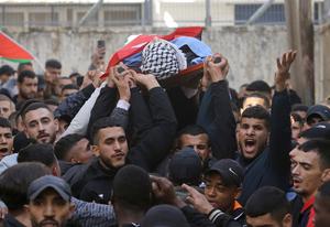 (251117) -- NAPLUSA, 17 noviembre, 2025 (Xinhua) -- Imagen del 16 de noviembre de 2025 de personas cargando el cuerpo de un palestino de 16 años, en el campamento de refugiados de Askar, en el este de la ciudad cisjordana de Naplusa. Un adolescente palestino murió y otro hombre resultó herido el domingo durante una incursión israelí en el norte de Cisjordania, de acuerdo con fuentes palestinas. (Xinhua/Nidal Eshtayeh) (rtg) (ah) (vf)