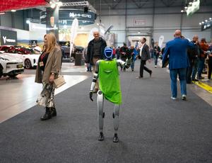 (251115) -- PRAGA, 15 noviembre, 2025 (Xinhua) -- Imagen del 14 de noviembre de 2025 de un robot humanoide reaccionado en el séptimo e-SALON, en Praga, República Checa. El e-SALON, una feria comercial para vehículos de pasajeros y comerciales con propulsión alternativa, abrió sus puertas al público el viernes y permanecerá hasta el domingo. (Xinhua/Dana Kesnerova) (oa) (da)