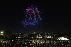 (251115) -- SEUL, 15 noviembre, 2025 (Xinhua) -- Personas observan un espectáculo de luces con drones en el Parque del Río Han, en Seúl, República de Corea, el 15 de noviembre de 2025. (Xinhua/Jun Hyosang) (oa) (da)