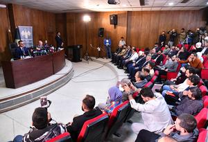 (251117) — DAMASCO, 17 noviembre, 2025 (Xinhua) — Imagen del 16 de noviembre de 2025 de Hatem al-Nassan (i, en el podio), jefe del comité nacional de Siria para la investigación de los disturbios en Sweida, hablando durante una conferencia de prensa, celebrada en Damasco, Siria. El comité nacional sirio encargado de investigar los disturbios de Sweida informó el domingo que varios miembros del Ejército y de las fuerzas de seguridad habían sido detenidos después de que las investigaciones confirmaran sus violaciones durante los recientes disturbios en la provincia sureña de Sweida. (Xinhua/Ammar Safarjalani) (rtg) (ah) (vf)