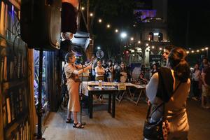 (251115) — MONTEVIDEO, 15 noviembre, 2025 (Xinhua) — Imagen del 14 de noviembre de 2025 de una mujer leyendo poemas afuera de una librería durante la novena edición de la Noche de las Librerías, en Montevideo, capital de Uruguay. (Xinhua/Nicolás Celaya) (nc) (jg) (da)
