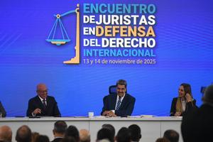 (251114) -- CARACAS, 14 noviembre, 2025 (Xinhua) -- El presidente venezolano, Nicolás Maduro (c), reacciona junto al presidente de la Asamblea Nacional de Venezuela, Jorge Rodríguez (i), durante el Encuentro de Juristas en Defensa del Derecho Internacional, en Caracas, Venezuela, el 14 de noviembre de 2025. (Xinhua/Marcos Salgado) (ms) (jg) (da)