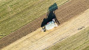(251119) -- BEIJING, 19 noviembre, 2025 (Xinhua) -- Vista aérea tomada con un dron el 19 de noviembre de 2025 de una máquina agrícola trabajando en un campo, en Shangqiu, en la provincia de Henan, en el centro de China. (Xinhua/Xu Zeyuan) (jg) (da) (ce)