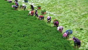 (251119) -- BEIJING, 19 noviembre, 2025 (Xinhua) -- Vista aérea tomada con un dron el 19 de noviembre de 2025 de agricultoras cosechando verduras, en Hezhou, en la región autónoma zhuang de Guangxi, en el sur de China. (Xinhua/Liao Zuping) (jg) (da) (ce)