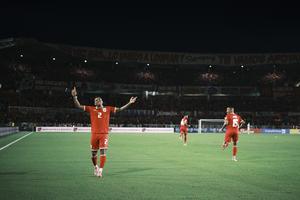 (251119) -- CIUDAD DE PANAMA, 19 noviembre, 2025 (Xinhua) -- Imagen del 18 de noviembre de 2025 del jugador César Blackman (i), de Panamá, festejando su anotación durante el partido ante El Salvador correspondiente a las Eliminatorias para el Mundial de Estados Unidos, México y Canadá 2026, celebrado en el Estadio Rommel Fernández, en la Ciudad de Panamá, capital de Panamá. (Xinhua/Xu Yongzheng) (ah) (ra) (ce)