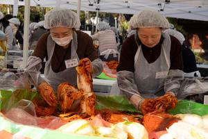 (251116) -- SEUL, 16 noviembre, 2025 (Xinhua) -- Personas preparan kimchi, un encurtido de verduras, para un evento para compartir en el templo Jogyesa, en Seúl, República de Corea, el 16 de noviembre de 2025. Los habitantes locales prepararon kimchi, que será compartido con sus vecinos necesitados, durante el evento celebrado el domingo. (Xinhua/Jun Hyosang) (oa) (ah)