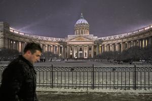(251119) -- SAN PETERSBURGO, 19 noviembre, 2025 (Xinhua) -- Imagen del 18 de noviembre de 2025 de un hombre caminando frente a la Catedral de Kazán durante una noche nevada, en San Petersburgo, Rusia. (Xinhua/Guo Feizhou) (jg) (da) (ce)